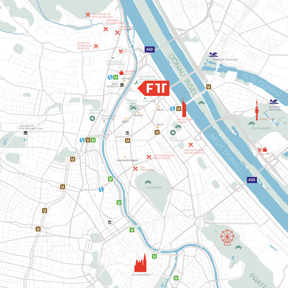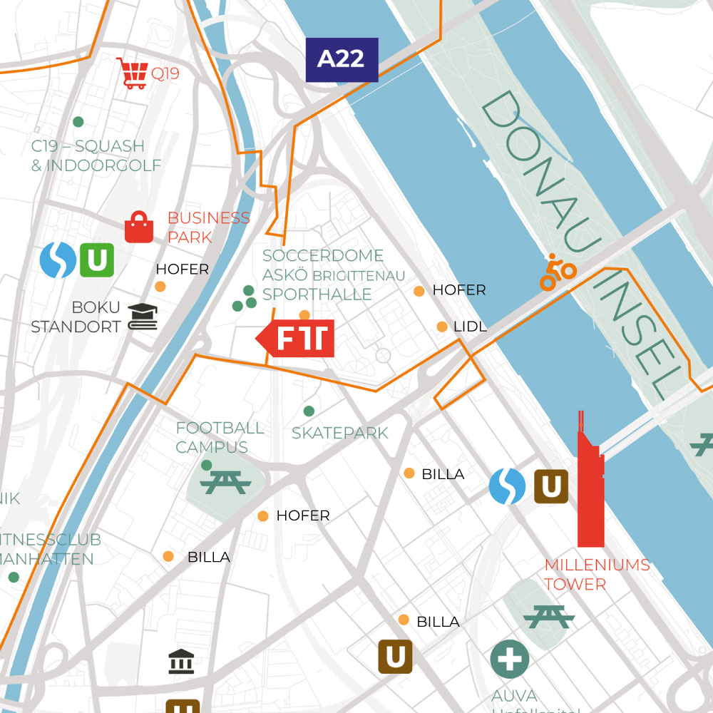 Und für alle, die schnell mit dem Auto aus der Stadt herauswollen: Die Donauufer-Autobahn A22 ist in fünf Minuten erreichbar – damit ist auch eine Anbindung an weitere Autobahnen und Schnellstraßen in verschiedene Richtungen gegeben. Der Flughafen Wien-Schwechat ist schnell und unkompliziert zu erreichen, ohne durch die Stadt fahren zu müssen.